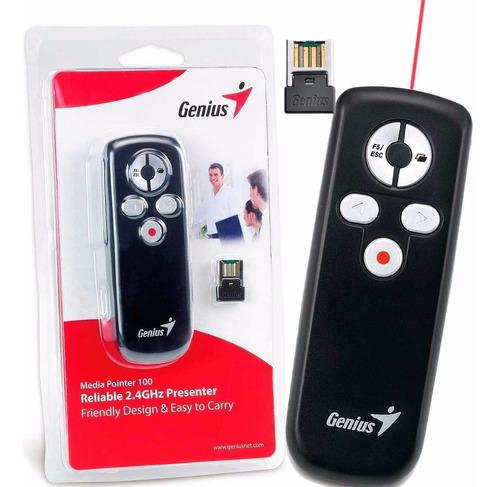 Puntero presentador multimedia Genius Media Pointer 100 con luz láser. Teclas de avance y retroceso de página, F5, Esc y Blank. Inalambrico, Alcance de hasta 10 metros sin interferencias. Receptor 2,4 GHz, con conexión USB. Funciona con 2 pilas AAA, LR03 Windows y Mac OS.