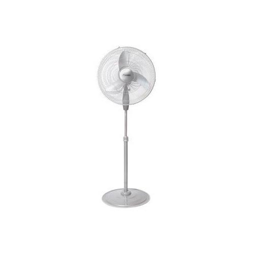 Ventilador pie 20" altura 1,80mts, pala metálica de 3 aspas. Base redonda metálica estable, protector térmico. Reja radial. Motor 70W. Cabezal oscilante y reclinable. Color platil.