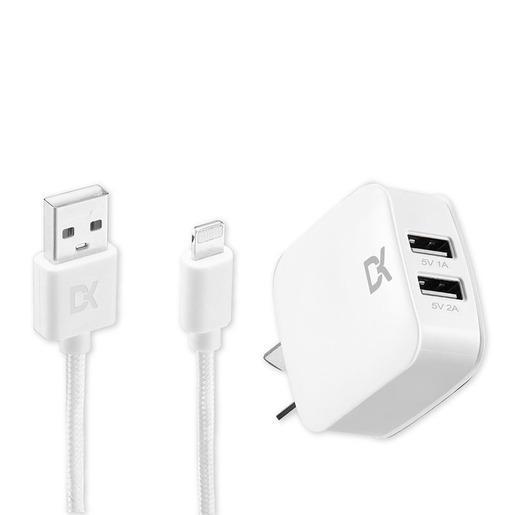 Cargador de pared + Cable Lightning. Cargador doble puerto de entrada USB. Salida: 5V - 2.0 A. Cable con carga y sincroniza datos. Amperaje: 2A. Salida: Lightning.