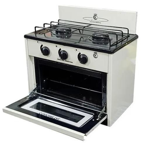 Para Gas Envasado (Garrafa) Cocina de 2 hornallas con horno. Con regulación independiente de temperatura. Con puerta rebatible de vidrio. Quemadores de horno y hornalla enlozados. Reja de estante de horno de acero. Medidas externas: Ancho 50 Prof. 30 Alto 43cm