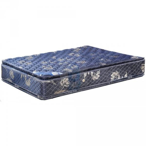 Estructura de resortes bicónicos alta resistencia, doble marco perimetral de acero y 6 estabilizadores laterales y transversales. Tapizado con capa de tela aislante con doble capa de espuma alta densidad. Funda acolchada totalmente con matelassé multicapas de espuma soft. Tela Jackard. 4 agarraderas laterales y 4 aireadores. Confeccionado con Pillow System Euro Top de alta performance.